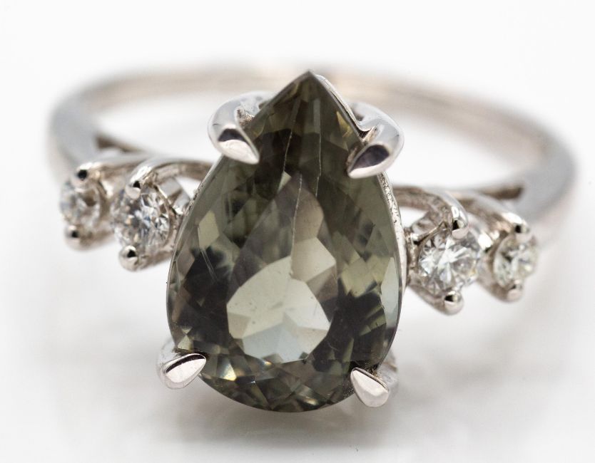 A hallmarked 18ct white gold and Cuprian Tourmaline & Diamond Ring. The ring set wit a large tourmaline approx 12mm x 8mm 3.48ct and flanked by four  round brilliant cut VS diamonds (total approx 0.20ct). Total weight approx 4.3g. Size N/O.