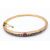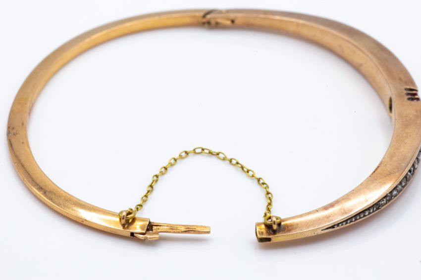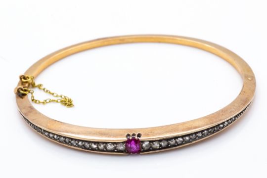 An antique 18ct gold ruby and diamond hinged bangle. The bangle set with a central ruby flanked by tapering channel set rose cut diamonds completed with safety chain. French assay import mark to clasp. Weight 16.83g. Measures  approx 7.5 inches inside circumference.