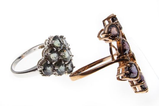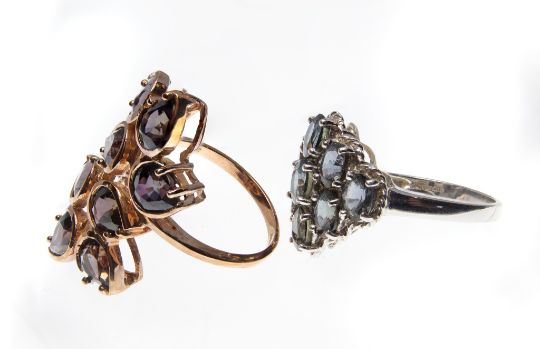 Two hallmarked 9ct gold & colour change sapphire rings. A 9ct rose gold finger ring having 8 pear cut colour change sapphires 6mm x 5mm of Tanzanian origin, in a naturalistic setting, weight 4.67g, size N. A white gold and colour change sapphire cluster ring set with 9 oval cut colour change sapphires  5mm x 4mm of Madagascan origin. Weight 3.9g. Size N.5. (Total weight 8.57g)