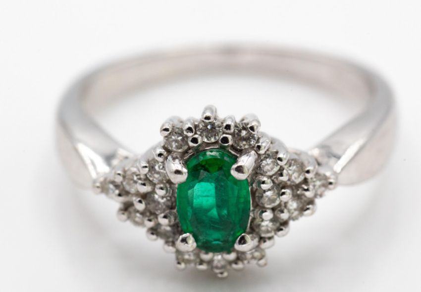 A hallmarked 18ct gold emerald and diamond ring. The ring set with a central oval cut Zambian emerald (approx  4mm x 6mm - 0.33ct) framed by 18 round brilliant cut diamonds. Hallmarked Birmingham.  Weight 5.07g. Size N/O.