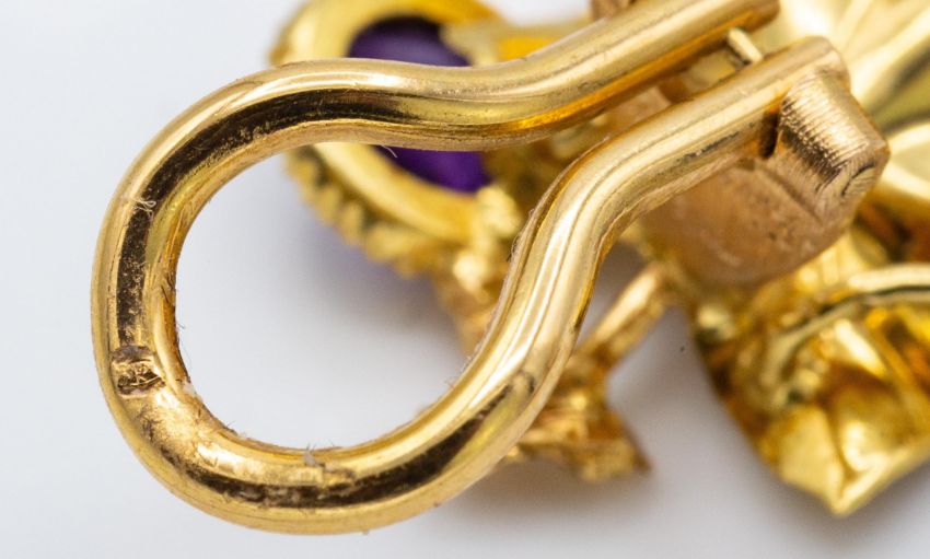 A pair of signed Buccellati 18ct gold and amethyst ear clips. The earrings of naturalistic leaf form having bezel set round mixed cut amethyst completed with clip clasp verso. Signed Buccellati