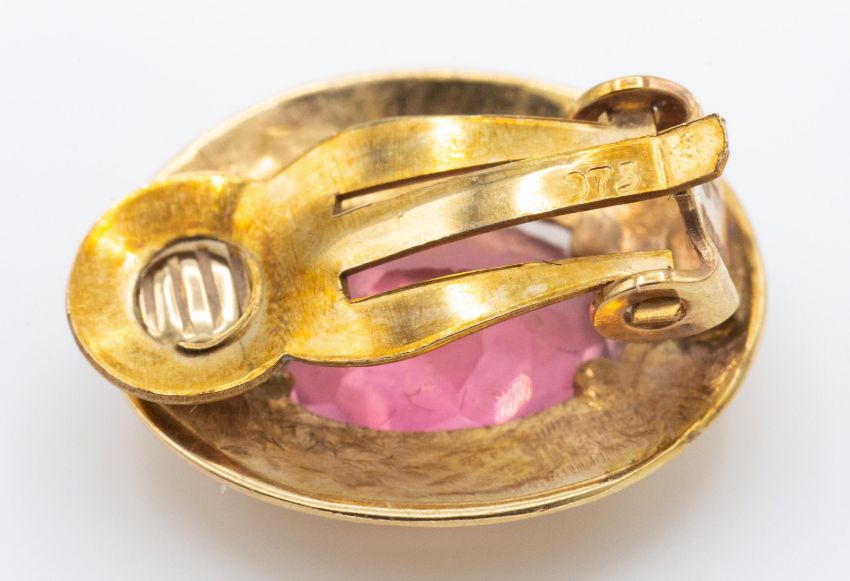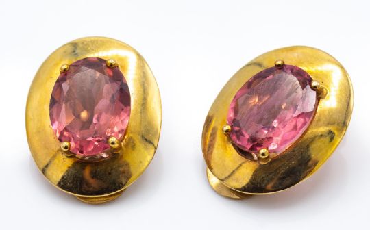 A  pair 9ct gold tourmaline earrings. The ear clips set with oval cut pink tourmaline 10 x 8mm 4.53ct in a gold frame having clip fasteners. Weight 3.85g. Measures 1.8cms. Marked 375.
