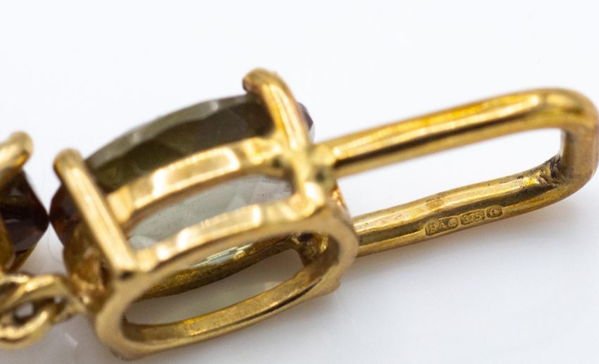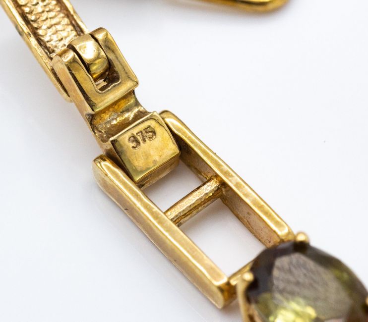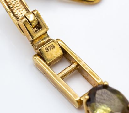 A hallmarked 9ct gold and Brazilian andalusite bracelet. The bracelet set with 18 oval cut andalusite (approx 14.5ct). Weight 9.08g. Measures 7 1/2 inches.
