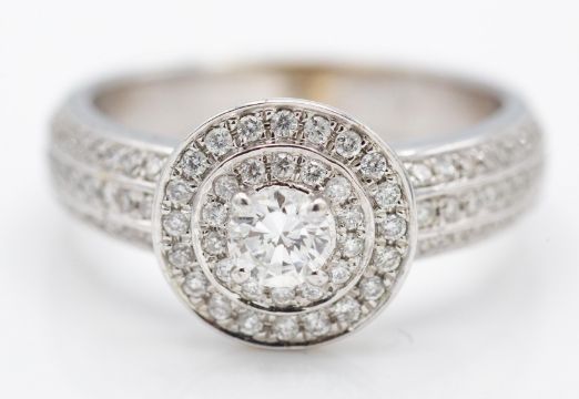 A 9ct white gold and diamond halo style cluster ring. Estimated diamond weight approx 0.85cts, The roundel with central brilliant cut stone with diamond halo and accents to shoulders. Hallmarked and stamped 375, sponsors mark CH. Total weight 4.5g / Size L
