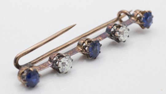 An antique gold sapphire and diamond bar brooch pin. The brooch set with three mixed cut sapphires and two old cut diamonds too knife bar having twin pin and c clasp.  Sapphires measure   approx  centre 5.2mmx4.7mmx2.7mm   side 5.2mmx4.7mmx2.7mm. Estimated diamond weight approx 0.50ct each. Un marked tests indicate 9 - 15ct gold. Measures 5.3cm. Weight 4.65g.