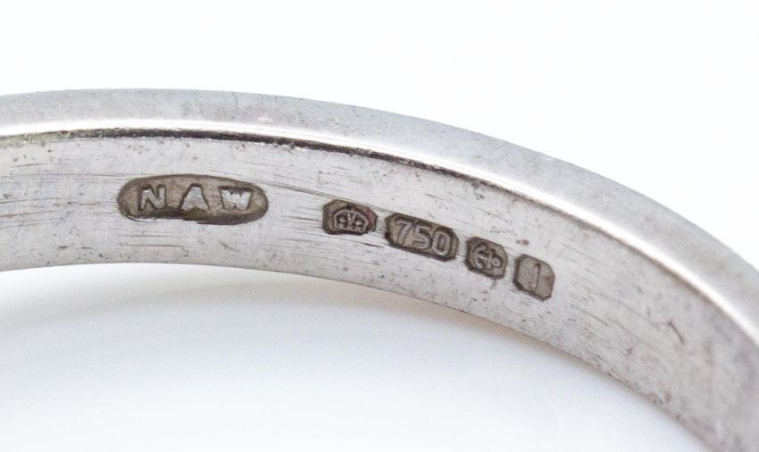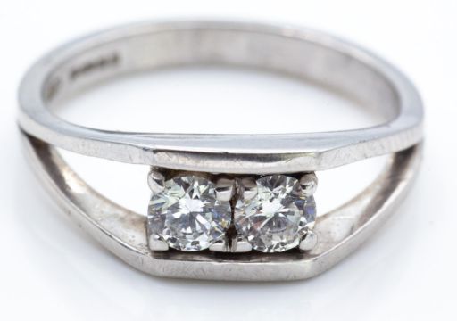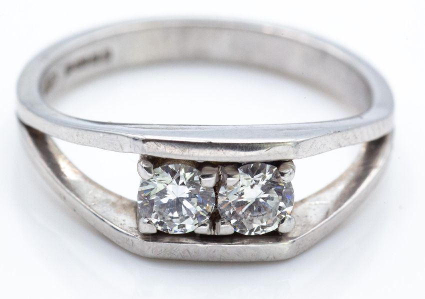 A hallmarked 18ct white gold and diamond ring. The ring set with two round brilliant cut diamonds (Approx 0.17ct each. Total 0.34ct,  VS G/H). Total weight 3.6g. Size K.