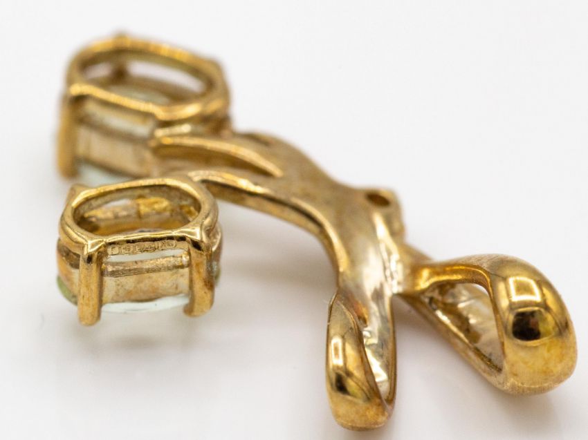 Two hallmarked 9ct gold and gem set necklace pendants. An amblygonite and diamond set pendant. Measures approx 2cms. Weight approx 1.2g. A pink topaz and diamond necklace pendant. Measures 2.4cms. Weight 2.1g. Both Hallmarked Birmingham.