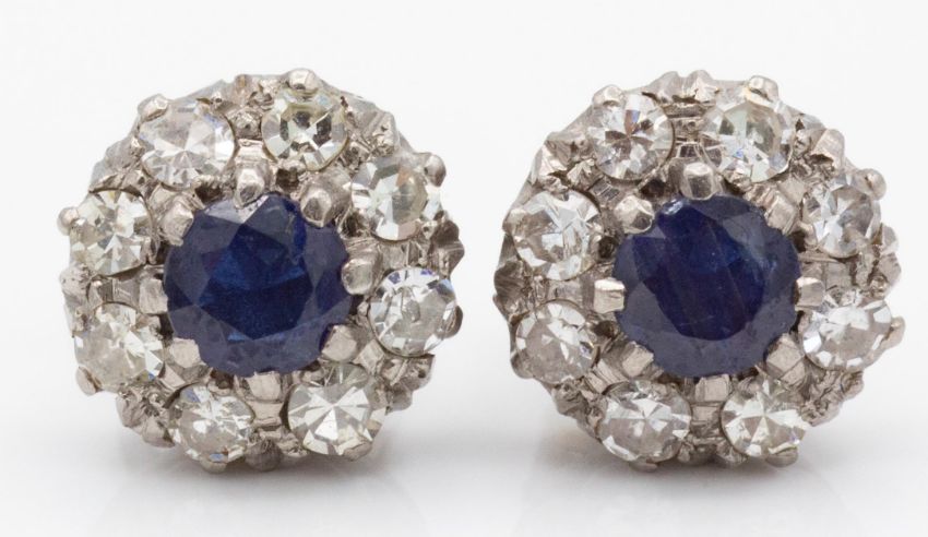 A pair of sapphire and diamond cluster earrings. The earrings set with central round cut sapphires surrounded by eight single cut diamonds (total estimated diamond carat weight 0.80ct) having post backs and butterfly fasteners. Weight 3.8g