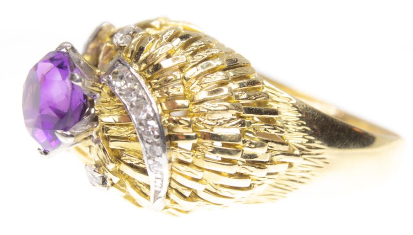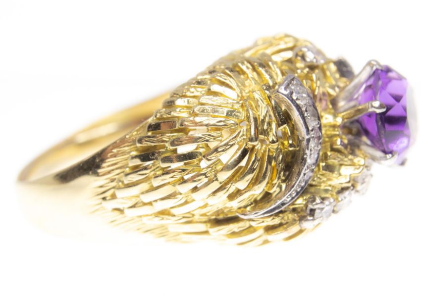 An 18ct gold amethyst and diamond cocktail ring. The ring set with a central round cut amethyst atop a fringe style domed setting having 16 round brilliant cut  diamond accents. Marked 18ct tests. Weight 15.2g. Size approx M.