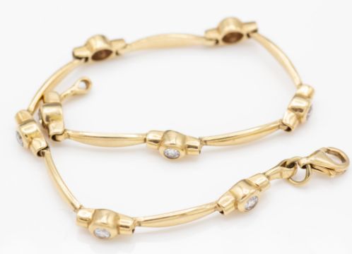 A 9ct gold and CZ adorned bracelet chain. The bracelet with bow links having inset round cut CZ spacers. The bracelet uniting with a c-clasp. Total weight 7.61g / Length 7"