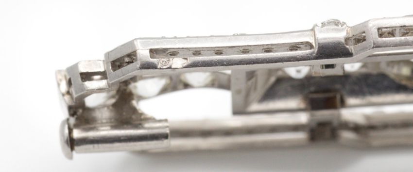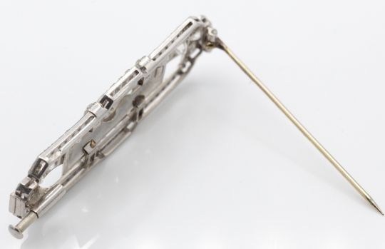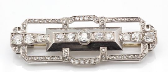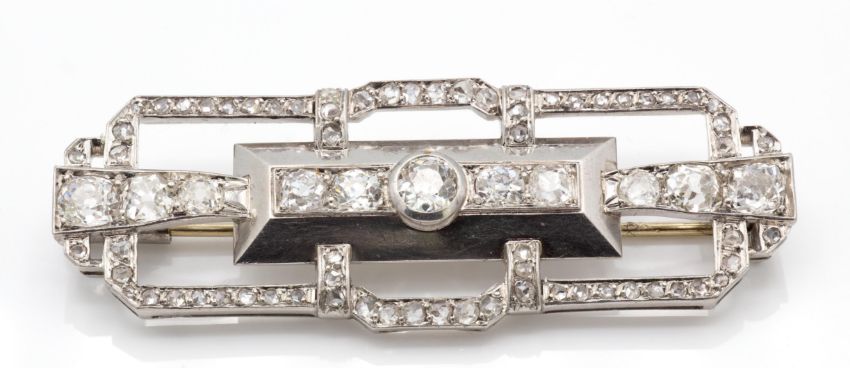 A French Art Deco 18ct gold platinum and diamond plaque brooch pin. The brooch set with a central line of old cut diamonds (approx 1.5ct) having a geometric frame of rose cut diamonds and completed by trombone clasp. French assay mark for platinum and makers mark to body. Weight 13.95g. Measures 5.5cm x 1.8cm.