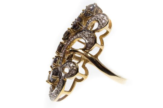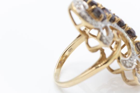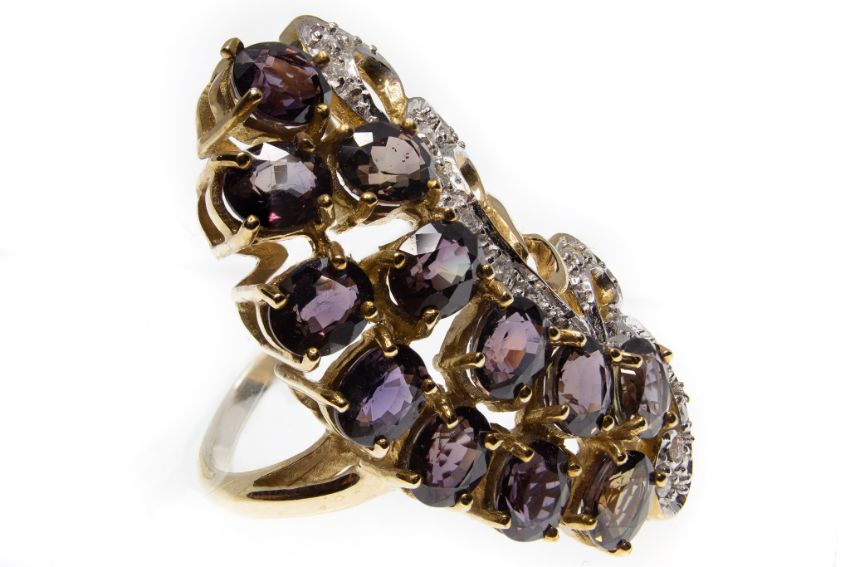 A hallmarked 9ct gold colour change sapphire and diamond ring. The ring a large naturalistic scrolling motif set with 12 oval cut 5mm x 4mm colour change sapphire of Tanzanian origin and 14 round brilliant cut diamonds approx 0.14ct. Head measures approx 3.5cm x 1.8cm. Total weight 8.27g. Size M.5.