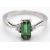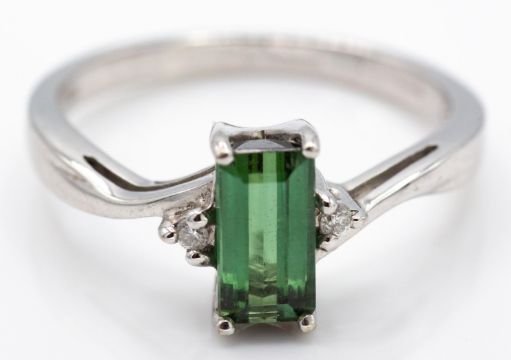 A hallmarked 18ct white gold green tourmaline and diamond ring. The ring set with a baguette cut green tourmaline (approx 7mm x 4mm) flanked by 2 round brilliant cut diamonds. Weight 3.2g. Size N.5