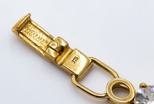 A hallmarked 9ct gold and Zircon bracelet. The bracelet set with 15 round cut Zircon  (approx 15ct) with elliptical spacers in an articulating mount. Measures 7 3/4 inches. Total weight 14.88g.