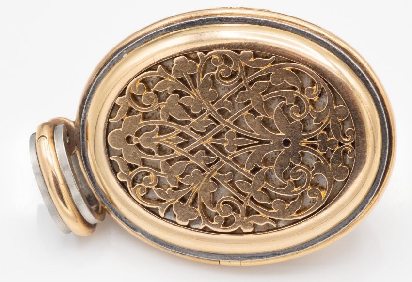 An antique French 18ct gold platinum and diamond locket pendant. The pendant Having fine pierced decoration to front and back completed  with layered platinum and gold with a principal old cut diamond with rose cut diamond and pearl layered motif. The locket opens to reveal a glazed interior.  French assay import marks Swan / Mascaron/ Owl to bale - French Eagle mark to body. Measures approx 5cms inc bale x 4cm. Weight 48.07g