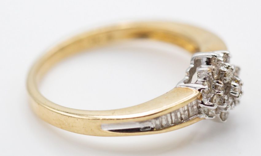 A 9ct gold Hallmarked diamond cluster ring. The ring set with central cluster of diamonds within channel set rows of baguettes. Birmingham hallmarked, sponsors mark GO. Total weight 2.76g  / Size O