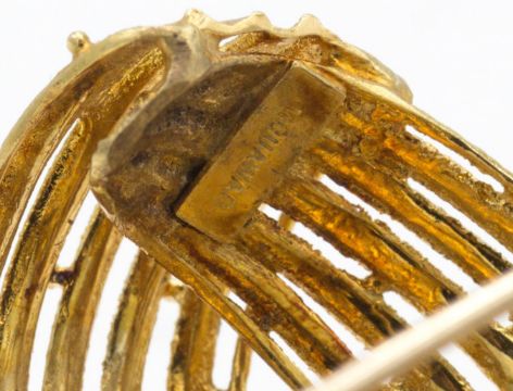 A signed Mouawad 18ct gold ruby and emerald brooch pendant pin. The wirework brooch pendant in the form of an orchid having round mixed cut ruby and emerald tipped stamen including integral pendant bale. Bought in the 1980's, never worn. Total weight 16.85g.  Measures approx 4cm x 3.5cm. Signed Mouawad. XRF testing concludes 18ct gold.