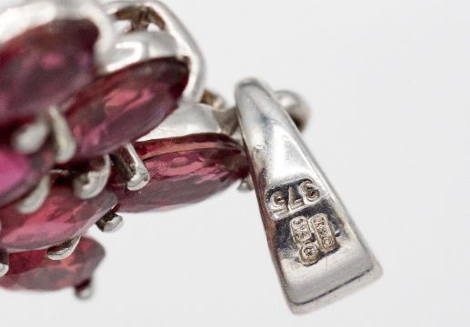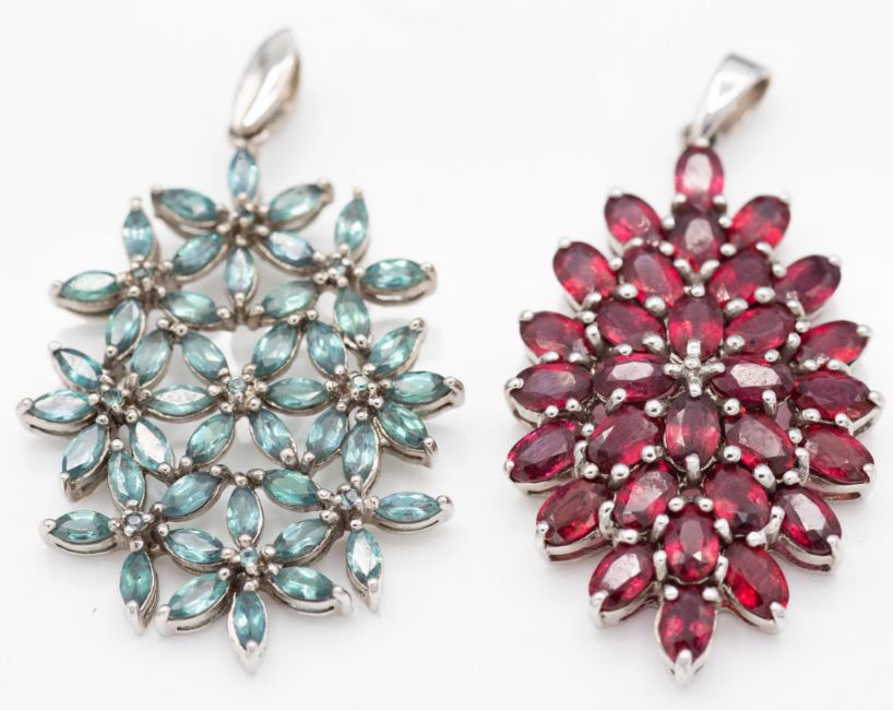 Two 9ct White Gold Necklace Pendants. A hallmarked 9ct white gold and AAA Tanzanian ruby necklace pendant. The pendant formed from 30 oval mixed cut AAA Tanzanian ruby (approx 8ct). Measures 4.2cms. Total weight approx 5.7g. A large 9ct white gold and Alexandrite floral cluster (pendant approx 3.02ct) . Weight approx 5.2g. Measures 4.3cms.