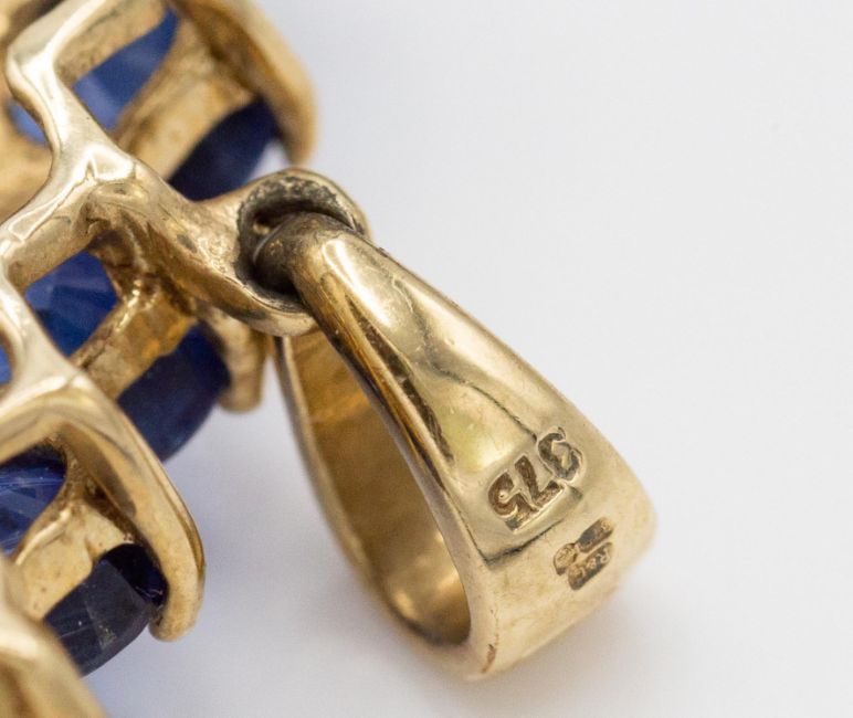 Two hallmarked 9ct Gold Kyanite & Diamond Necklace Pendants. A hallmarked 9ct yellow gold kyanite and diamond necklace pendant. The pendant set with 25 round cut blue kyanite with diamond accents. Hallmarked Birmingham. Total weight approx 5.2g. Measures approx  3cms x 2.5cms. A hallmarked white gold kyanite and diamond pendant set with approx 5ct of oval cut kyanite with diamond set stylised ribbons. Hallmarked Birmingham. Measures 3.6cms. Weight approx 3.7g.