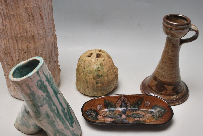 A good collection of vintage studio art pottery ceramic wares to include vases of vases classical form with similar decoration, candlestick, an owl paperweight, hedgehog paperweight, etc.