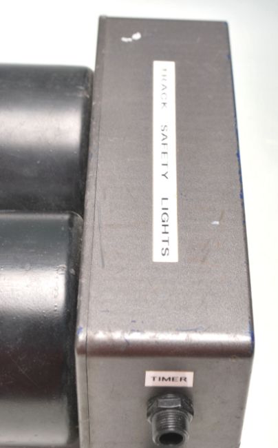 A contemporary set of red and green traffic lights / track safety lights within a black plastic case with red and green coloured panels. Measures 19cm x 10cm x 15cm.