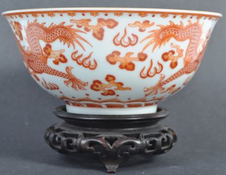 An 18th / 19th Century Chinese antique Jiaqing (1796-1820) mark and period porcelain bowl of remarkable quality having hand painted ocher iron red depicting two dragons chasing the flaming pearl. Six character seal mark to underside of small foot with remains of a museum / collection label. Measures: 15cm x 8cm. Condition: No visible damage.