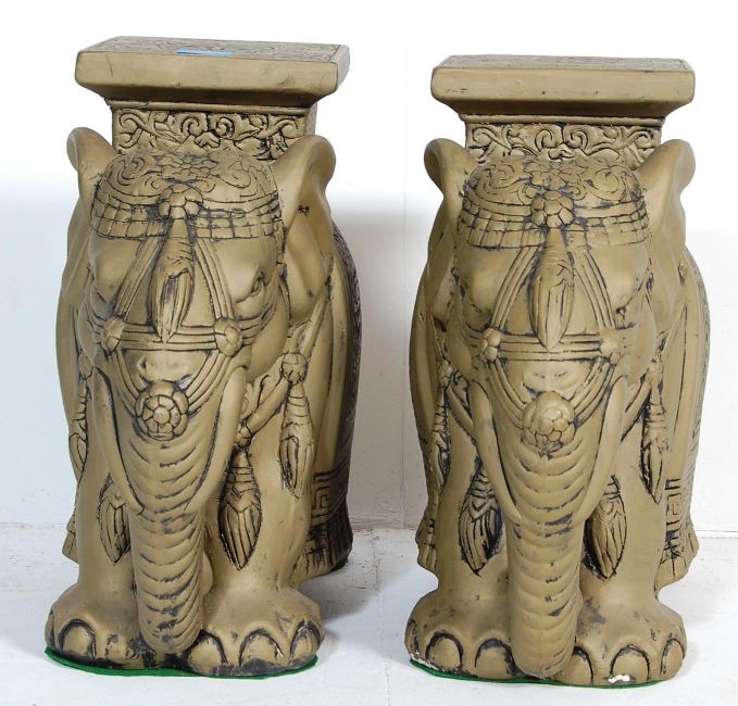 A pair of 20th century Ceramic Plant Stand / stools in the form of an Asian / Indian Elephant. Both being decorated with traditional oriental motifs. Measures 44 H x 47 W