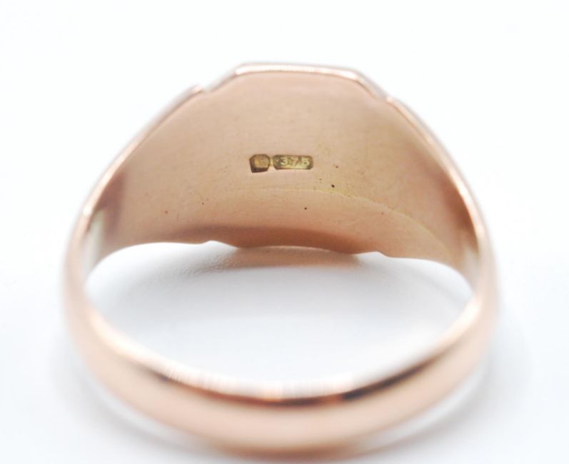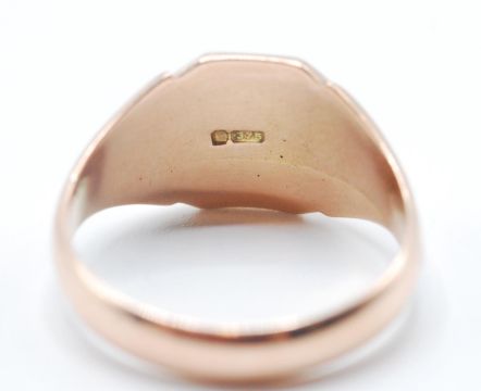 A hallmarked 9ct gold signet ring having a square head with reeded shoulders. Hallmarked Chester 1916. Weight 4.4g. Size R.5.