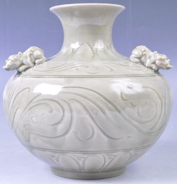 A large 19th Century Chinese antique porcelain vase having a Celadon glaze. The vase of squat form with three Foo dog handles to sides. Globular body decorated with light waves / scrolls with waisted neck and circular rim. Measures: 19cm x 20cm.