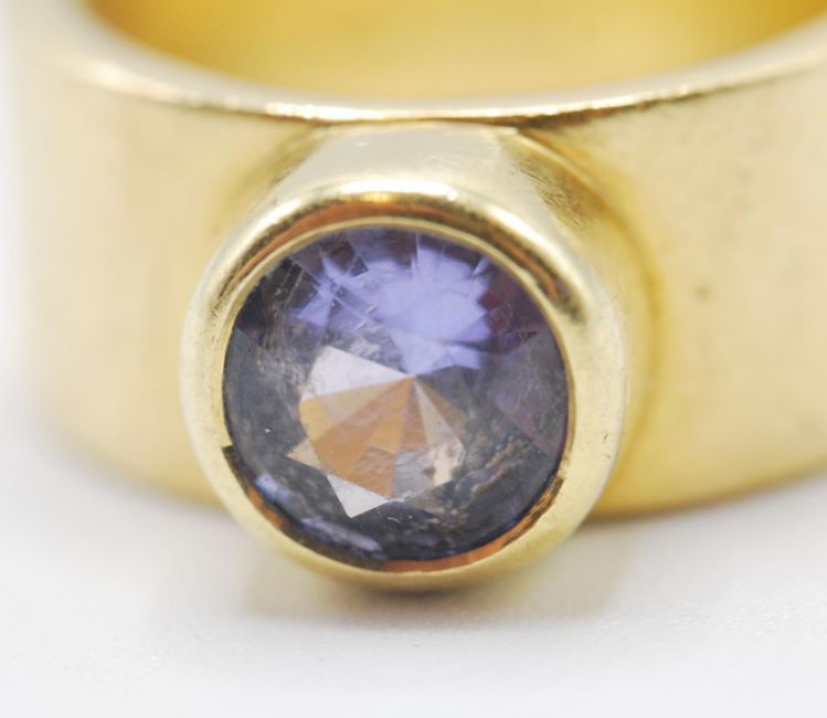 A hallmarked 18ct gold band ring bezel set with a round cut blue sapphire. Assay marked Birmingham 750. Weight 11.5g. Size G.