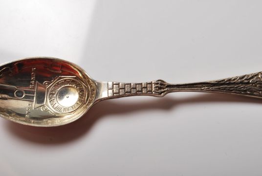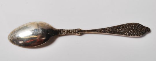 A silver hallmarked mid Century 1960's birth record spoon the handle modelled as a crane holding a baby, the bol of the spoon having a raised clock with unengraved sections for month, year, pounds and inches. Hallmarked Birmingham 1966. Weight 35.5g.