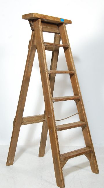A vintage mid century A frame ladder / folding ladder with oversized top step. Measures 137 H x 15 W x 45 D.