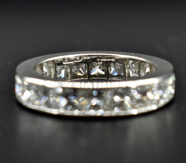 A hallmarked 18ct white gold and diamond eternity ring. The ring set with 20 princess cut diamonds approx 0.25cts each in a calibrated channel setting. Hallmarked London.  Estimated colour F-H. Estimated clarity VS -VVS. Estimated total diamond weight 5cts. Weight 6.3g. Size N.