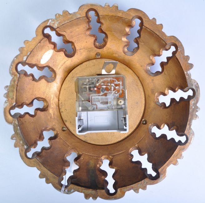 Smiths - A retro vintage 20th century wall clock having a silvered dial with gilt faceted hands and set to a golden scroll sunburst type case. Actim movement to verso. Measures: 23cm wide.