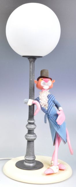 Pink Panther - A vintage retro 20th Century Italian Pink Panther novelty lamp depicting the iconic character leaning on a lamp post in dinner wear with top hat. Measures: 52cm high x 21.5cm diameter.