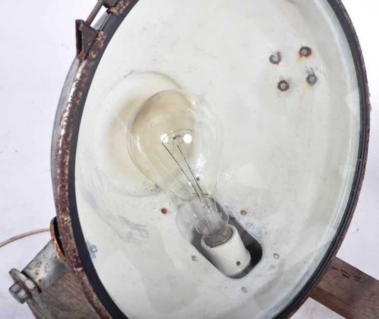 Two vintage early 20th Century WWII Second World War landing light strip swivel lights each set with a single large bulb set within a metal case with large round glass panels to the front. White finished interiors with each being mounted upon two boards. Each measures approx 60cm x 58cm x 81cm.