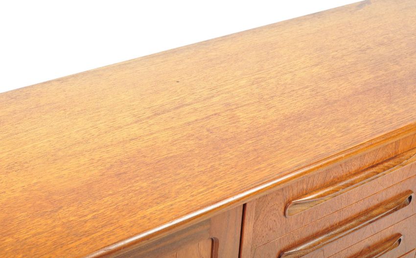 Victor. B. Wilkins - G-plan - Fresco range - A good retro vintage mid 20th Century 1960's teak wood sideboard credenza by G Plan comprising a central bank of four drawers flanked by twin door cupboards revealing shelved interiors. The handles being lipped to each door and drawer and the unit raised on tapering legs with stretchers. Measures 80cm x 213cm x 45cm.