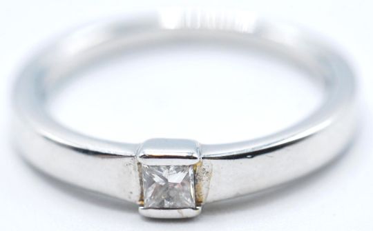 An 18ct white gold and diamond ring being channel set with a princess cut diamond. Gold unmarked but tests as 18ct gold. Weight 2.7g. Size L.5.
