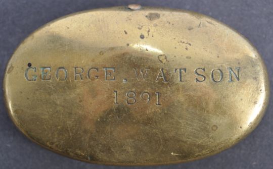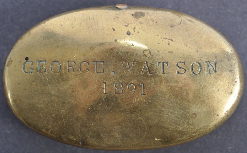A late 19th Century Victorian antique coal miners small brass tobacco or snuff box, punched to the top George Watson 1891. According to the 1891 census George was born in 1861 and was a coal miner in Gloucester. The oval hinged box measuring approx 8cm