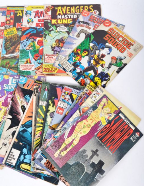 DC & Marvel Comics - A mixed collection of vintage DC & Marvel comics with UK and US issues for various superheros. The comics and issues include The Mighty World Of Marvel No.10, The Avengers issues #3, #24 and #27, Spider-Man No. 68, Suicide Squad issues #13 and #18, The Avengers Master Of Kung Fu issues #29, #30, #37, #38 and #49. Guardians Of The Galaxy issues #23 APR, #24 MAY, X-Men #3 JUL, Son Of Ambush Bug #86 OCT, Who's Who #85 APR, Justice League issues #24 FEB and #35 FEB and #6 Jul, Batman In Detective #625, Tales Of The Teen Titans No. 62, New Gods Issues #1 x3 and #3, Infinity No. 41 and 42, Legends No. 5, Video Jack 1, The Visitors Are Our Friends No. 4, Legion Of Super-Heroes issues #317 and #340, Detective No. 592, Blue Beetle issues #3, #14 and #15, Thunderbolt No. 1, PSI Force issues #13 Nov and #18 Nov, The New Warriors 1 of 8, King Kong No. 3 of 6, Kazar #26 May and #21 Dec, Skull The slayer #3 Jan, Legend Of The Shield #3, Voltron #2 of three issues and The Saviour issue 5. The comic books of varied condition.