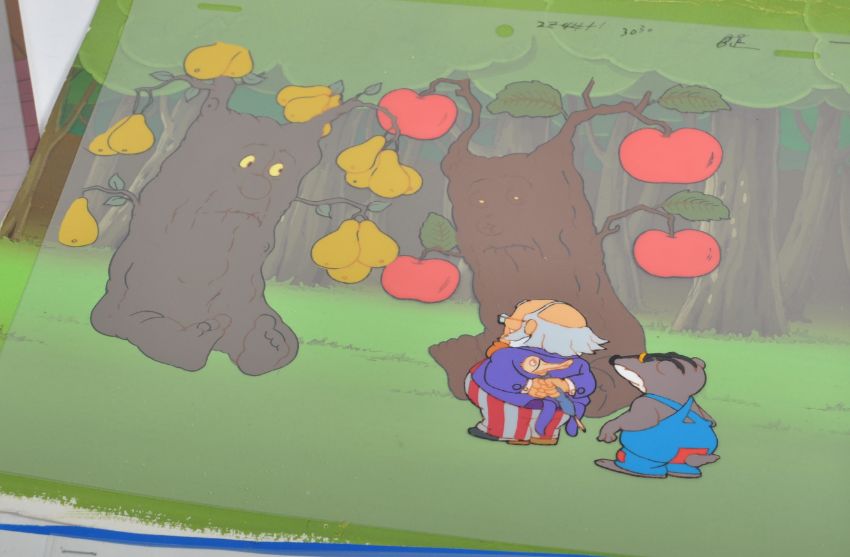 Doctor Snuggles (1979) - ITV / Channel 4 - a rare collection of x4 original production used animation artwork cels from the classic cartoon series. Animation for the series was split between two countries and this appears to be from the Topcraft Studio based in Japan. The artwork depicts a variety of scenes and characters, and all feature their original hand painted backgrounds, with acetate painted overlays. Each approx; 23cm x 28cm, but some sizes do vary slightly.