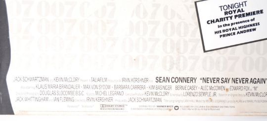 James Bond - Never Say Never Again (1983 starring Sean Connery) - an original quad sized advertising poster board from the ' Royal Charity Premiere ' in London, at the Warner Theatre, Leicester Square. The board featuring alternative artwork from the British Quad poster, printed on hardboard. Featuring a laid-on piece which reads ' Tonight - Royal Charity Premiere - In The Presence Of His Royal Highness Prince Andrew '. 30x40". Rare item of 007 memorabilia.