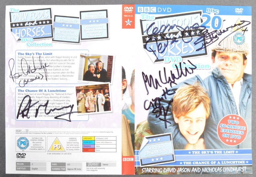 Only Fools & Horses - a DVD cover from the series autographed / signed to the front by x6 original cast members to include; Tessa Peake Jones (Raquel), Sue Holderness (Marlene), John Challis (Boycie), Gwyneth Strong (Cassandra), Ron Aldridge (Bronco) and Patrick Murray (Mickey Pearce). All signed in black ink. Obtained in person by the vendor.