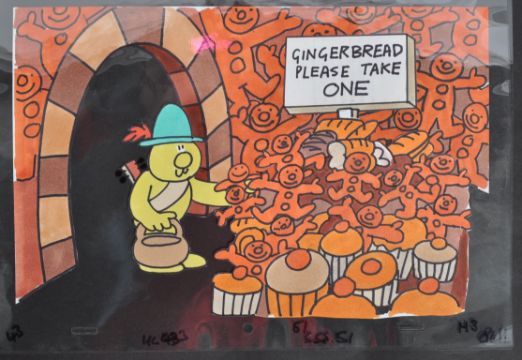 Animation Artwork - Henry's Cat (1980s) - created by Stan Hayward and Bob Godfrey (Roobarb & Custard) - a collection of x4 original hand painted production used animation acetate artwork cels (appearing to be from the same episode). Each multi-layered. Each annotated with production markings to the margin, all with original painted backing sheets present. Rare memorabilia from the classic cartoon series. Backing sheets A4, acetates larger. Henry's Cat is a British animated children's television series, created by Stan Hayward and directed by Bob Godfrey, who was also the producer of Roobarb and Noah and Nelly in... SkylArk. The show starred a yellow feline, known only as Henry's Cat, and his many friends and enemies. In every episode, narration and character voices were provided by Bob Godfrey. Henry's Cat was first screened by BBC Television in the United Kingdom on 12 September 1983, and aired 51 episodes. Five series were made in total