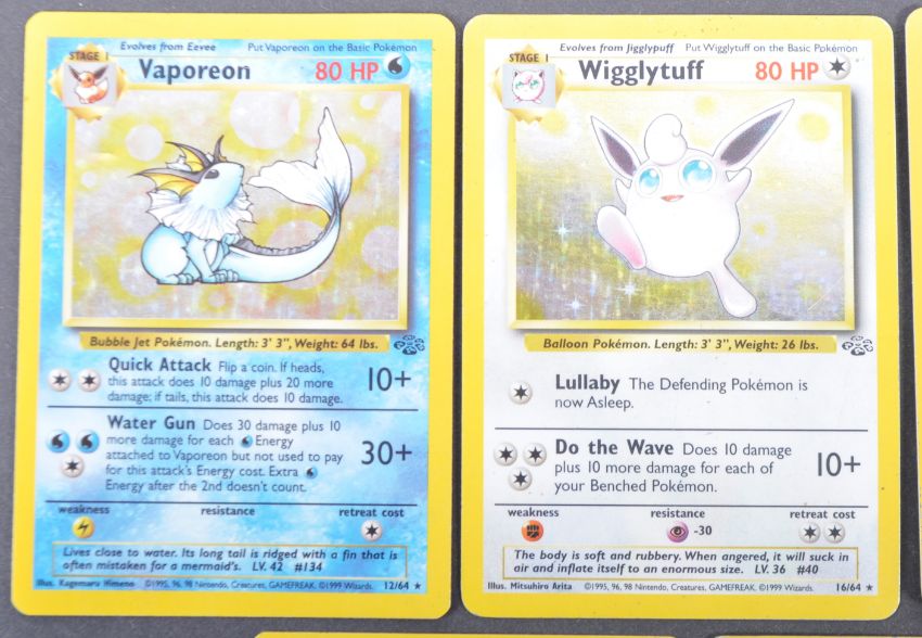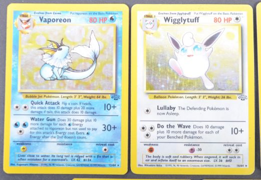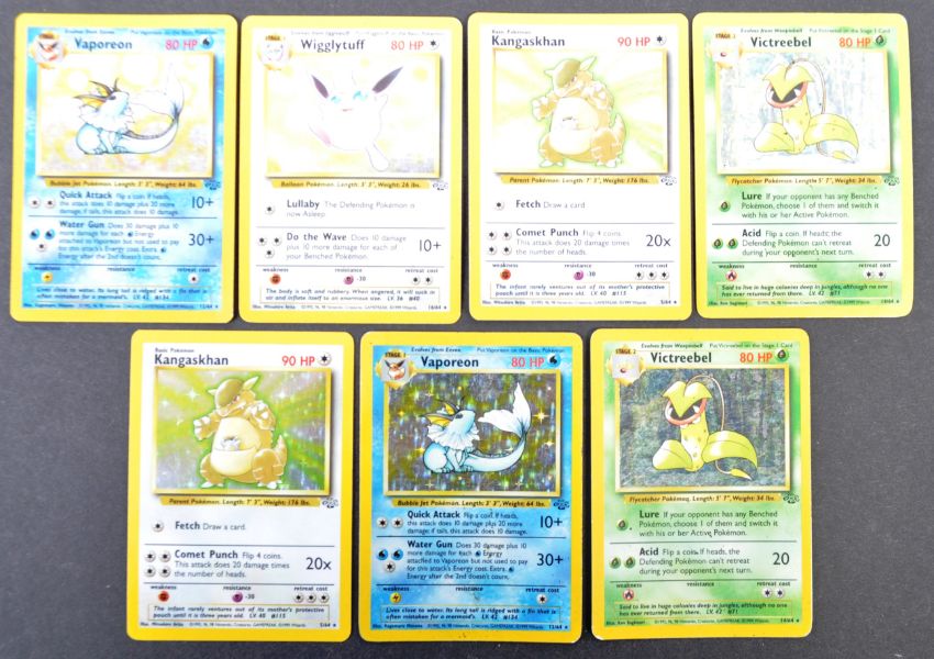 A collection of 7x original vintage 1990's Wizards Of The Coast Pokemon The Trading Card Game Pokemon Cards - all holo shiny examples from the original Jungle Deck set. Comprises 14/64 Victreebel, 12/64 Vaporeon, 5/64 Kangaskhan, 14/6 Victreebel, 14/64 Wigglytuff, 5/65 Kangaskhan and 12/64 Vaporeon. Cards in various conditions from played - good. Great original cards.