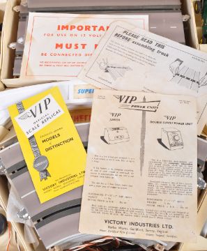 An original vintage Scalextric type ' VIP Raceways ' slot car racing box set model R1 with track and cars. The set including x2 cars, x2 controllers, x8 curved track units, x6 straights, x2 bridge units with supports and instructions leaflets.
