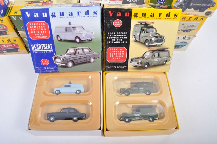 A collection of 15x Lledo made Vanguards 1/43 scale and 1/64 scale diecast models vehicles comprising four double sets and seven individual truck / haulage models. Includes: PO1002, HB1002, AU1002 & HB2002 limited edition /5000 sets. All appear mint in boxes. Good models.