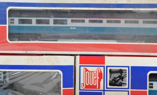 A collection of original Jouef made 00 gauge model railway trainset locomotive engines and carriages comprising a 8913 Type 4 2000HP Diesel Electric Locomotive, 5751, 5757, 5753 grey and blue Intercity coaches along with another unboxed example. Good collection.