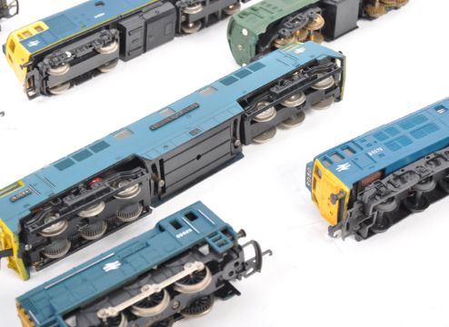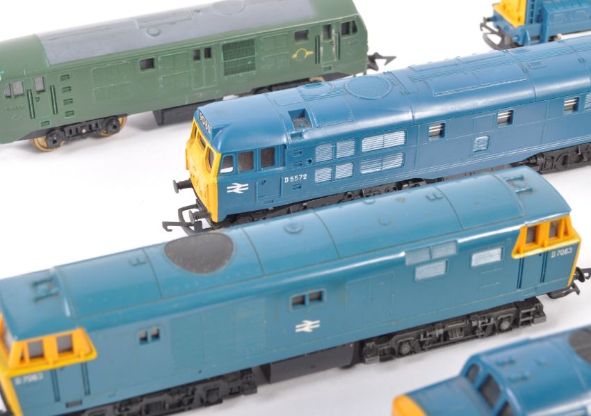 A collection of 8x vintage 00 gauge model railway trainset diesel locomotive engines comprising: Triang R357 D5572, Triang D3035, Triang R751 D6830, Triang Hornby D7063, Lima 09026, Lima D6524 and an unmarked green D6100 loco. The majority of the locos motors appear to function correctly. Good collection.