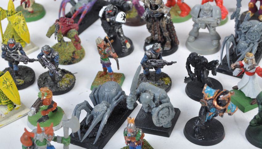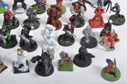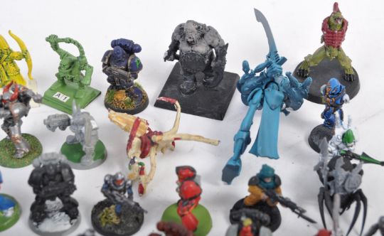 A large collection of over 100+ assorted Warhammer 40K, Fantasy and other tabletop wargaming miniature figures to include Space Marines, Chaos Space Marines, Astra Militarum Imperial Guard, Tyranids, Orks, Eldar, Necrons and others. In various conditions with different levels of paintwork throughout. Good collection.